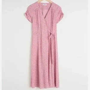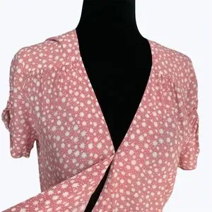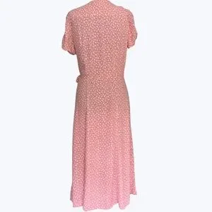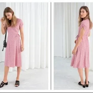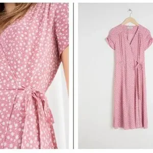 & Other Stories feminine pink ditsy floral v neck wrap midi dress with gathered puffed sleeves. Size 6. Hidden front snap closure keeps wrapped top in place. Side tie wrap. Short puffed sleeves with cute gathered detail.
