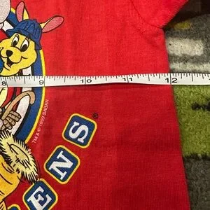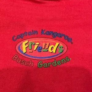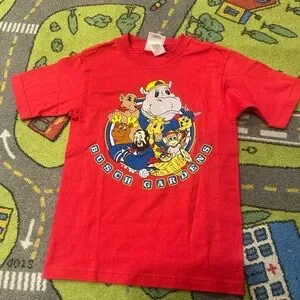 Vintage new without tags kids graphic t-shirt from 1999 featuring colorful animal mascots from Busch Gardens. Bright red tee with classic 90s theme park souvenir artwork.