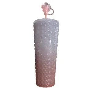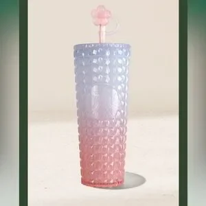Textured Starbucks tumbler with studded diamond pattern. Ombre finish shifting from lavender to soft pink. Includes matching lid and decorative straw topper. Lightweight and stylish for everyday use.