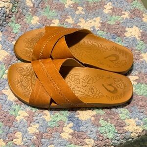Olukai Tan Leather Slide Sandals with Floral Footbed
