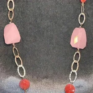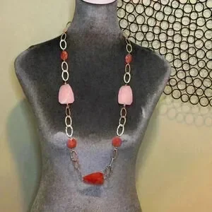 Necklace- Long light pink and dark pink plastic stones w/ hammered silver