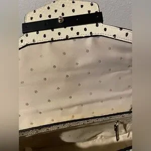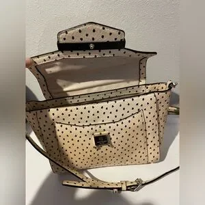 Stylish beige satchel in a faux-leather finish with a playful black dot pattern. Features a top handle and detachable shoulder strap for versatile carry. Sleek black trim and hardware add a polished look. Perfect for everyday use and easy to pair with neutral outfits.