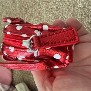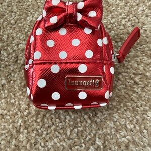 Shiny red mini backpack keychain with white polka dots. Decorative bow accent on top. Small front pocket with metal Loungefly tag. Zipper closure and loop for attaching to bags.