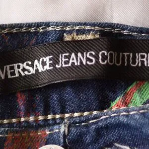 These Versace Jeans Couture jeans would be great to wear to an art show. There is a logo button on the front, and a black patch on the back with Versace imprinted as well as a logo button. Lots of colour to pair tops and jackets with. Size 27 on label. They measure Waist 27-28" Hips 34" Inseam 34". Made in Italy, Circa 1990s-2000s.