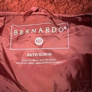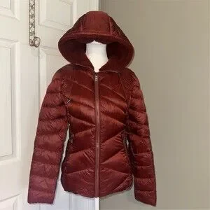 Bernardo EcoPlume Green women’s puffer jacket in size XS, regular fit. Color is a Rust brown with a Full zip front with zip pockets, ribbed hem, and an attached adjustable fleece-lined hood. Lightweight, water resistant, hypoallergenic, and machine washable. Suitable for everyday wear, commuting, travel, and casual outdoor activities in fall and winter.
