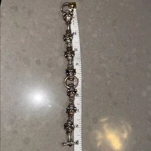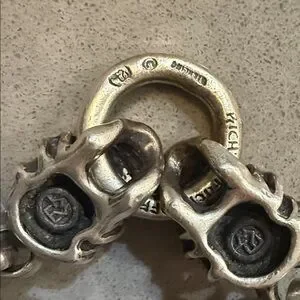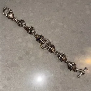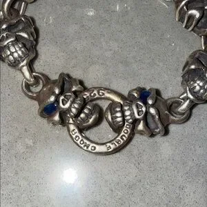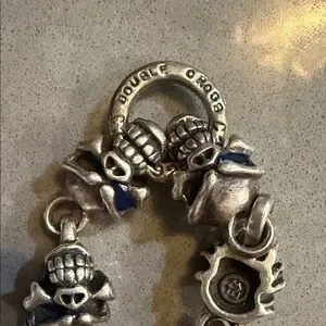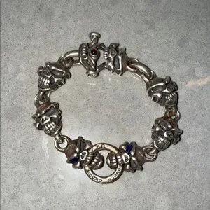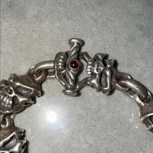 Rare!!! Custom made 🖤Authentic Travis Walker men’s bracelet in solid sterling silver featuring the iconic Double Cross / Menacing skull design with blue sapphire eyes. Heavy, detailed gothic biker style with signature skull and crossbone links. A rare collector piece from the renowned Travis Walker jewelry line. 2 blue sapphire stones in skull eyes & one red stone in the clasp