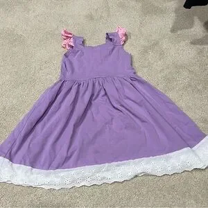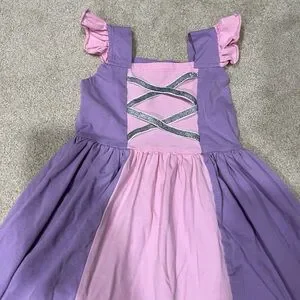 Sweet pink and lavender colorblock dress. Features ruffle shoulder straps and lace trim hem. Simple crisscross detail at the bodice like our favorite Rapunzel Princess.