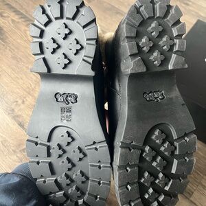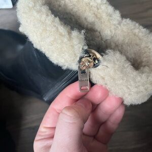 Stylish black boots with cozy cream fur trim. Perfect for winter wear.