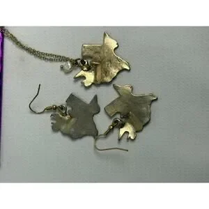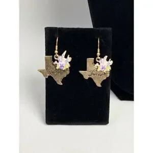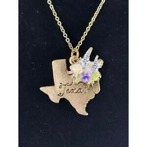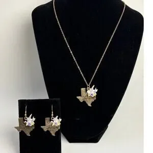 Texas State Shape Necklace and Earrings Matching Set w Blue Bonnets Gold Tone