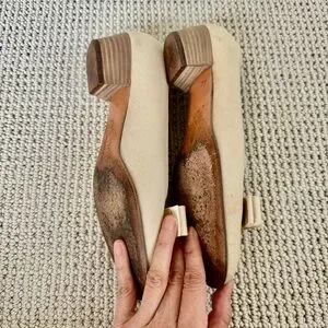 Bought in the 90s and have been keeping in the closet in a box. They are very clean other than the spots as my mom took very good care of them and only wore them for special occasions. Color is beige or ivory and has fainted yellow spots due to age. We have not yet tried to remove these spots so can’t say whether they are removable.