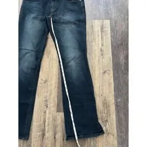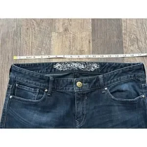 These are women's bootcut jeans from Express, featuring a classic dark wash and subtle fading. These jeans are designed for a stylish, casual look. They are in excellent used condition and are a size 10.