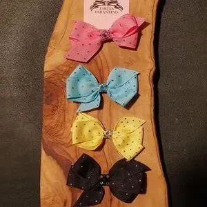 Little Lamb Bow Clip is approximately 3" wide and features French Ribbon, Swarovski crystal, salon-style clip, and ultrasuede patch on the back for maximum grip. The last picture is for illustration purposes. Thank you