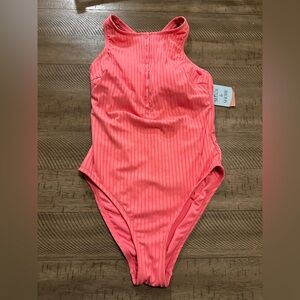 NWT Shade & Shore Ribbed Snap-Front High Neck One Piece Swimsuit - Coral M