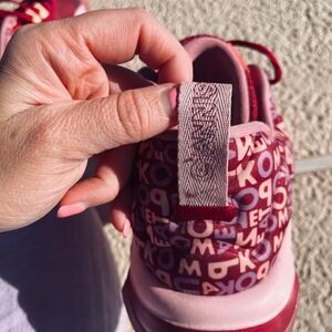 Giannis Immortality 3 basketball shoes in berry and pink. These performance sneakers feature a lightweight mesh upper with a distinctive alphabet-patterned heel wrap and large reverse Swoosh branding. Engineered with Nike Renew foam for responsive cushioning, the design includes a molded heel pull tab and a durable rubber outsole with multidirectional traction. The outsole is detailed with the names of Giannis Antetokounmpo's family members, adding a personal touch to this high-performance silhouette.