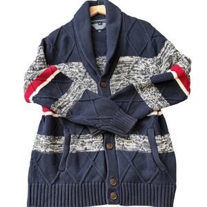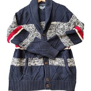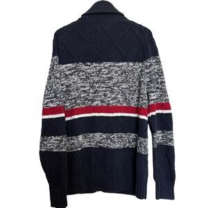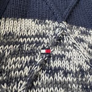 Chunky heavyweight knit cardigan from Tommy Hilfiger featuring a textured marled gray, navy, and red striped design with ribbed shawl collar and button front. Diamond knit paneling adds dimension, with front pockets and classic Tommy flag logo at chest.