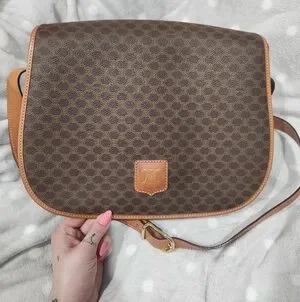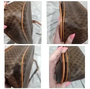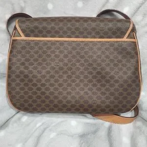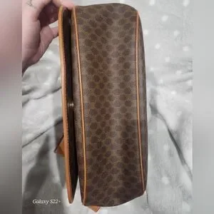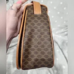 Celine Macadam shoulder bag with the brand's signature coated canvas and tan leather trim.