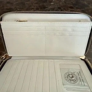 Brand New with a Zip Closure, Spartina 449 Wallet with a Detachable Wristlet Strap. Floral Pattern, with Ivory/Navy Stripe Linen Fabric and Leather Trim. Wallet has been stored in a Non Smokers Closet.