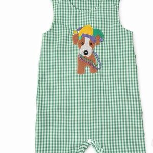 Green gingham romper with colorful puppy applique on front. Sleeveless, playful embroidered dog wearing a hat. Bright, fun colors add charm.