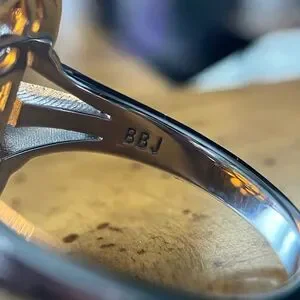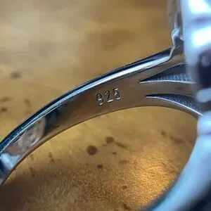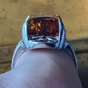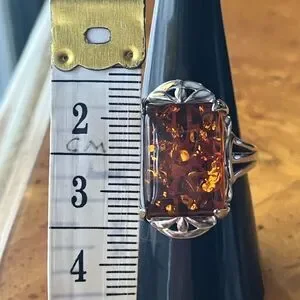 This beautiful ring features a real amber stone from Poland. The gemstone measures 16x12mm. The ring is set in solid .925 sterling silver with a rhodium plate to prevent tarnishing. The ring in the photos is the actual one you will receive. Size 8.
