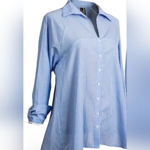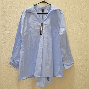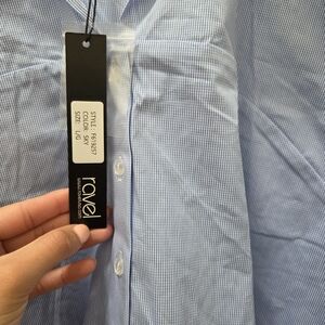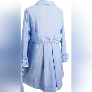 Elegant sky blue shirt with subtle checkered pattern. Features button-up front and classic design, along with cute cuffs and bow like design in the back.