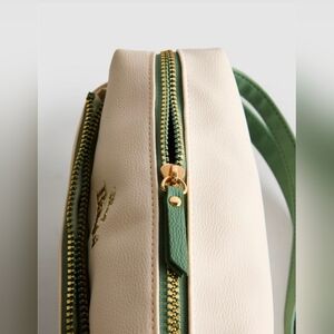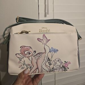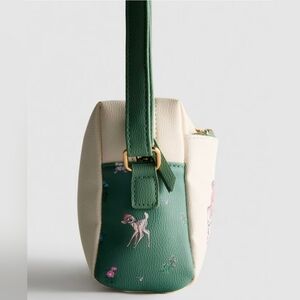 Charming crossbody in cream with green accents. Features playful Bambi artwork and gold-tone hardware. Comfortable adjustable green strap for hands-free wear. Ideal for Disney fans seeking a cute everyday bag.