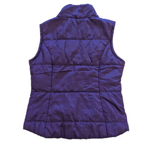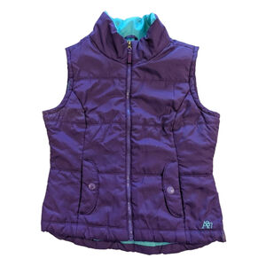This is a pre-owned Aeropostale women's puffer vest in purple with a teal lining, size S/P. The vest features a full-zip front closure and a stand-up collar. It has two front pockets with snap closures and an embroidered "A87" logo in teal on the lower left front. The material is 100% polyester for both the shell, lining, and polyfill. The vest measures approximately 21 inches in length from the shoulder to the bottom hem and about 18 inches across the chest. Vest is in great pre-owned condition.