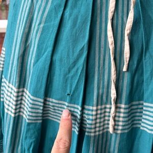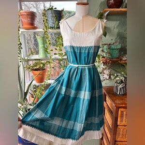 Vintage teal and white cotton dress with a soft scoop neckline, shoulder tie straps, and a fitted waist with self-tie belt.