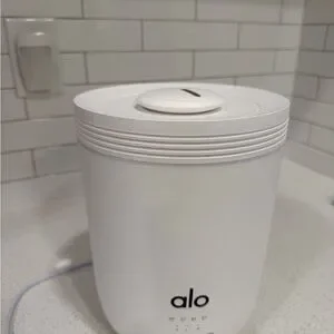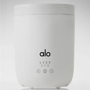 Sleek ALO Yoga ultrasonic diffuser. Simple touch controls and timer settings. Minimal modern design. Quiet operation for home or studio.