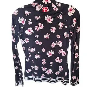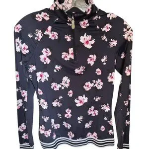 Striking long-sleeved navy shirt with pink flowers and striped trim. 1/4 zip. Excellent condition with no signs of wear. Ladies size XS.
