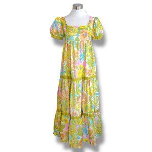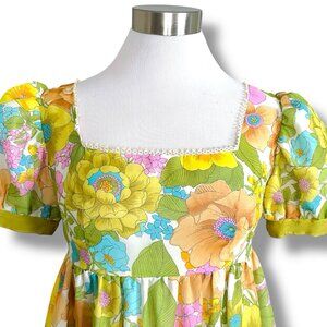 Vintage 1960s Womens Maxi Dress Sz Small Medium Boho Floral Puff Sleeve Tiered