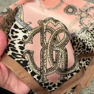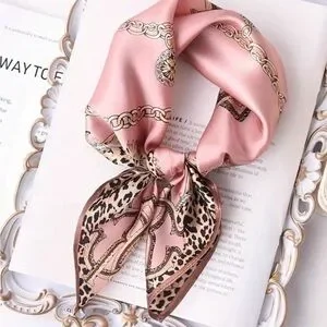 Elegant pink silk-look scarf with leopard and chain print accents. Lightweight, versatile accessory for styling around the neck, hair, or bag. The pink and brown tones add a feminine, chic touch to any outfit.