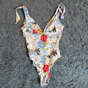 Instantly slip into tropical-vacation mode with this suit's fantastic island print. Wear it with or without the playful shoulder ties, depending on your mood.