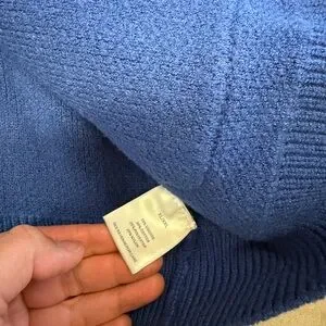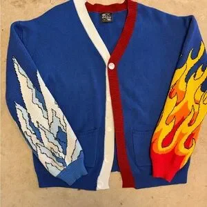 Bold blue cardigan with contrasting red and white trim. Features eye-catching yellow and red flame graphic on one sleeve and white/blue wave graphic on the other. Soft knit construction with front pockets and button closure. A standout piece for casual, streetwear-inspired outfits.