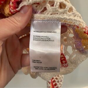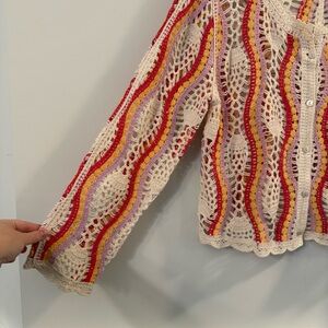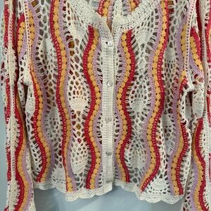 Open crochet knit button-front cardigan. Cream base with wavy stripes in red, pink and yellow. Lightweight, airy design. Feminine and playful look.