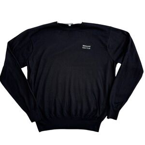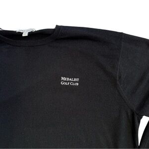 Peter Millar black crewneck sweater with Medalist Golf Club embroidery on chest. Premium knit made from merino wool and silk blend for a lightweight luxury feel. Classic ribbed cuffs and hem with timeless golf club style.