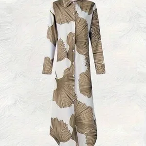 Chic white maxi shirt dress with bold brown floral motifs. Lightweight, button-front design offers easy wear and a flattering silhouette. Turn-up sleeves and front slit add modern elegance. Ideal for casual outings or daytime events.