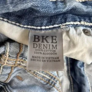 BKE Carter straight leg jeans in a light wash denim feature a classic five-pocket design with heavy contrast stitching and distressed detailing throughout. These 100% cotton jeans showcase signature embroidered back pockets and a branded leather waist patch. The relaxed fit through the hip and thigh paired with a straight leg.