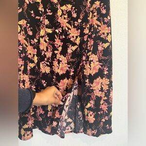 Beautiful Free People Retro Love printed midi skirt featuring a feminine floral print on a black background with soft pink tones. This flattering midi skirt has a button-front design with a front slit, giving it a relaxed boho vibe while still feeling polished and versatile.