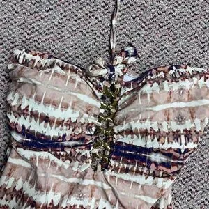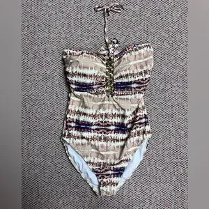 Halter one-piece swimsuit with gold jewelry front detail. Looks very elegant. Earthy striped print in beige, navy and white. Stretchy, lined design for comfort. Stylish and flattering silhouette. Was only tried on.