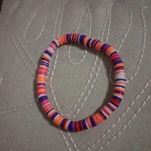 Stretch bracelet with flat disc beads. Bright orange, purple, pink, and white pattern. Lightweight and fun. Great for stacking. Smoke Free 🚬 & pet ♥️ free! Handmade with love, ready to gift!