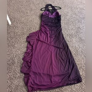 Glamorous purple maxi dress with halter neckline. Features a shimmering fabric and elegant drape. Ideal for formal events.