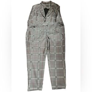 Chic gray plaid blazer with a relaxed tailored fit. Notched lapel and two-button front. Front patch pockets for easy styling. Refined plaid with subtle red windowpane detail. Versatile piece for work or elevated casual looks. In good used condition. Necklace is used as prop purposes only. Measurements are pants 38 inches in length, inner leg 27 inches, waist at 23 inches. Jacket length 35 inches, pit to pit 28 inches, pit to sleeve 17.5 inches, shoulder to sleeve 25 inches.