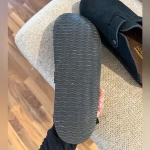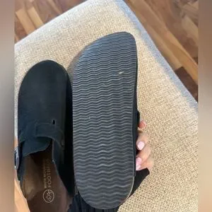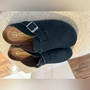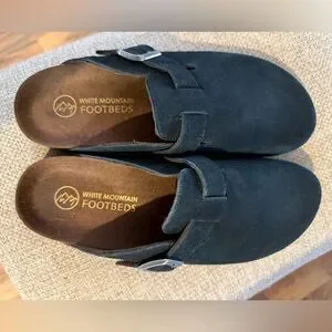 Elegant black suede mules by White Mountain. Features a chic metallic buckle. Perfect for any occasion. These are a Beautiful clog. But they were just too long for me.