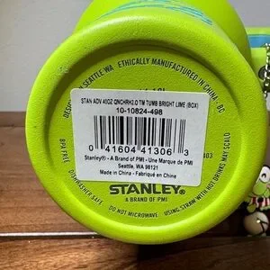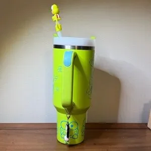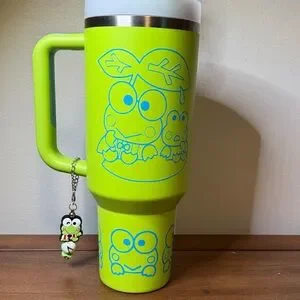 Vibrant lime green Stanley travel mug featuring Keroppi character graphics. Includes Keroppi lid topper and dangling charm. Sturdy handle and insulated design. Playful, collectible, one of a kind Stanley 40oz.