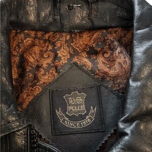 Stylish black leather jacket with a quilted lining. Perfect for a rugged, military-inspired look.