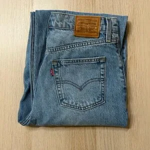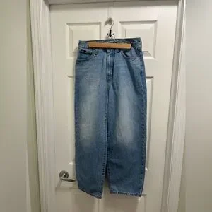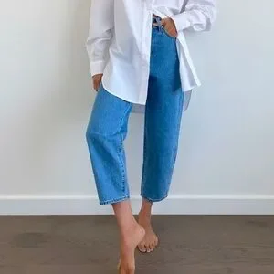 Classic straight leg silhouette. Mid-rise waist with clean finish. Timeless medium blue denim. Versatile for casual looks.
