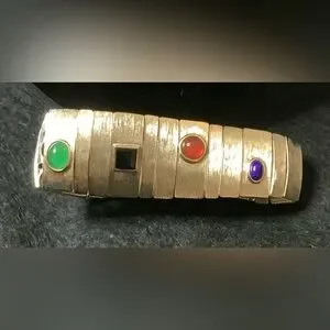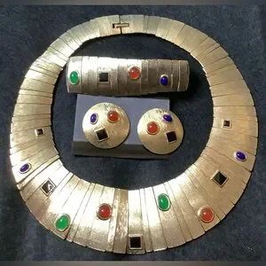 This stunning Egyptian jewelry set features a gold-toned finish with vibrant red, green, and purple accents. Perfect for adding a touch of elegance to any outfit.