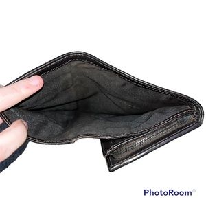Wallet includes bill fold section, 6 card slots, 2 slip pockets, one zippered section divided into 2.