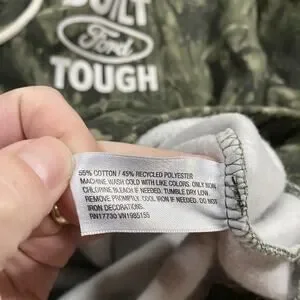 Markings: Interior neck tag shows Ford Official Licensed Product branding, size XXL, and made in China; inner care tag lists 55% cotton/45% recycled polyester with RN 17730 and code VN1985155 plus machine wash cold and tumble dry low care instructions.