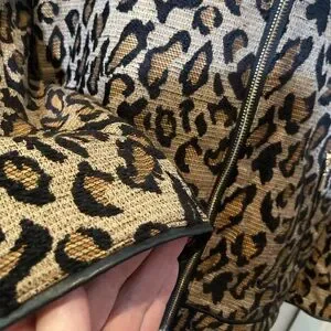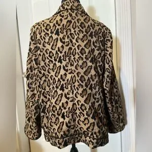 Black and tan leopard print jacquard jacket with gold hardware and a full front zipper. Designed with a notched collar, long sleeves, and two zip hand pockets. Faux leather accents add contrast, and the interior is fully lined in black for a polished finish.